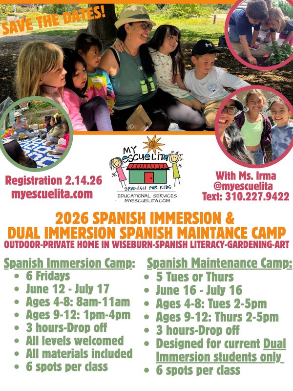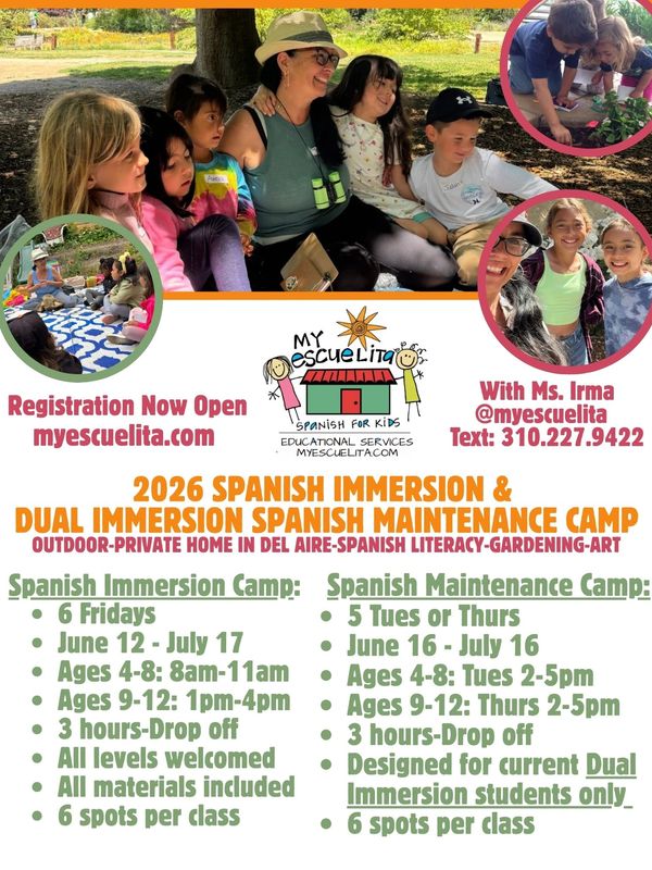 Join us for my 20th annual Spanish immersion camp for children in grades K–5, where curiosity, creativity, and connection grow alongside Spanish Language and Literacy. Choose from a Dual Immersion Spanish Maintenance Camp or a Spanish Immersion Camp in June and July, set in a warm, nature-based home and garden. Kids will explore Spanish literacy through listening, speaking, reading, and writing, dive into hands-on science and environmental learning like gardening, and express themselves through art—all in Spanish. Children will practice and learn Spanish in an outdoor cozy garden, cool indoor classroom and in an outdoor art studio. All in a private home in Del Aire.